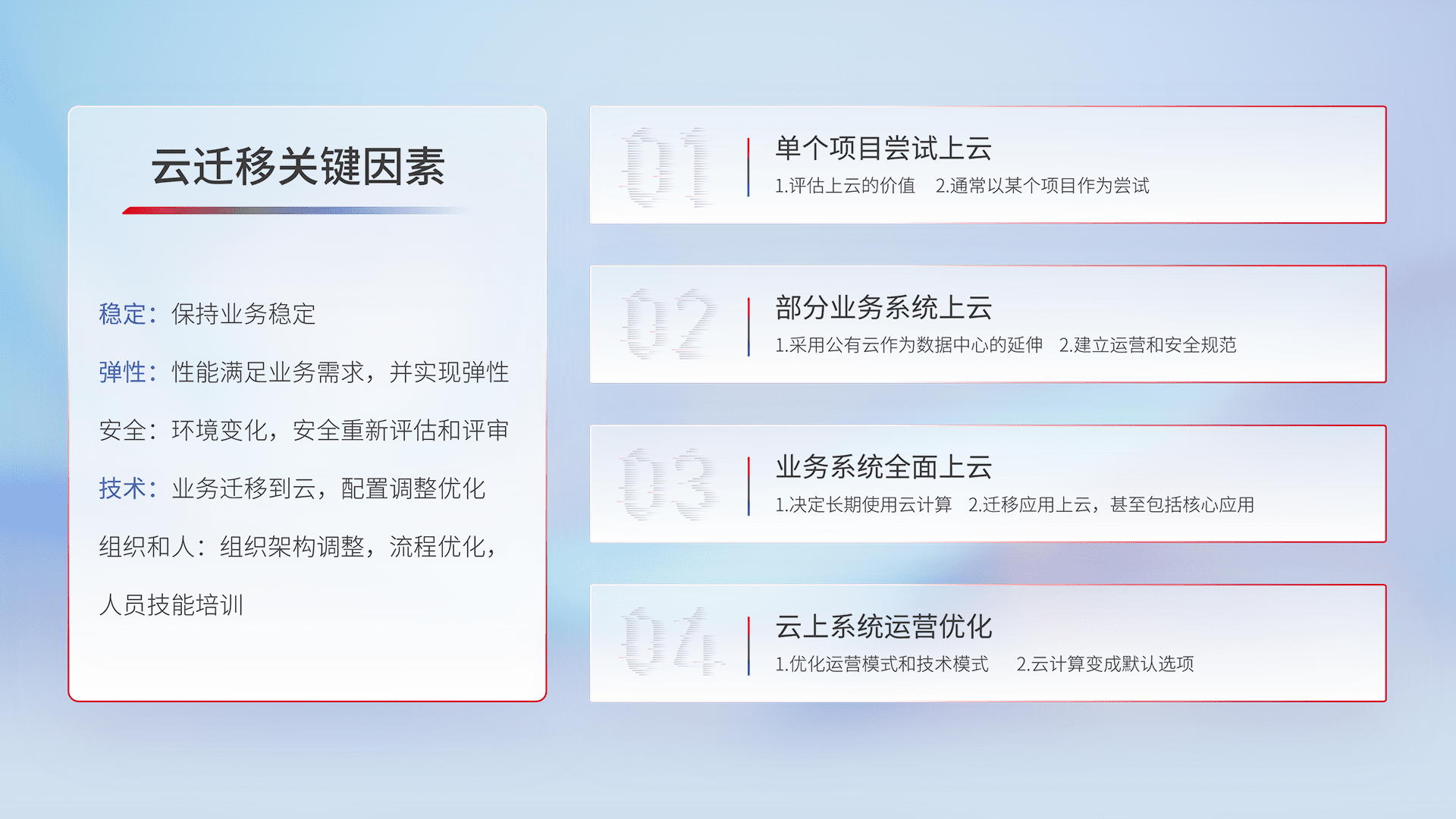 结合实际业务,,,从规划设计、、、、云平台选型、、、云原生改造、、数据迁移、、集成交付,,,迁移全过程为客户识别最佳上云路径,,,做好风险识别管理,,设计网络架构、、、、身份权限、、安全审计合规、、、、操作审计、、、日志审计、、、、监控告警策略、、、、多站点容灾设计等,,对云上基础设施进行整体规划,,,,提升IT治理水平,,,以满足弹性、、、高可用、、高性能的需求。。。